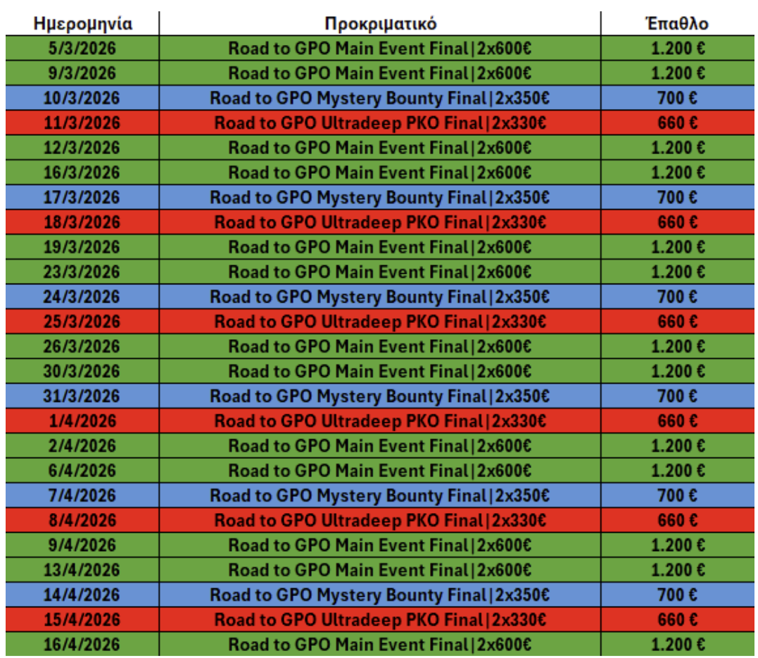 Καθημερινά θα τρέχουν freerolls και steps ξεκινώντας από 0.25€ τα οποία θα οδηγούν στα τελικά προκριματικά.